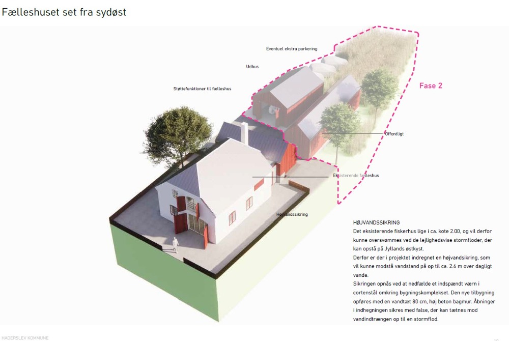 I forbindelse med helhedsplanen er der arbejdet intenst med at søge diverse fonde om midler til etablering af et ”Fælleshus” for lokalområdet i det gamle Fiskerhus. Arbejdet er gennemført i et stærkt samarbejde mellem kommunen, ved henholdsvis Fundraiser og projektleder, og ildsjæle fra Grundejerforeningen og Bådelauget.